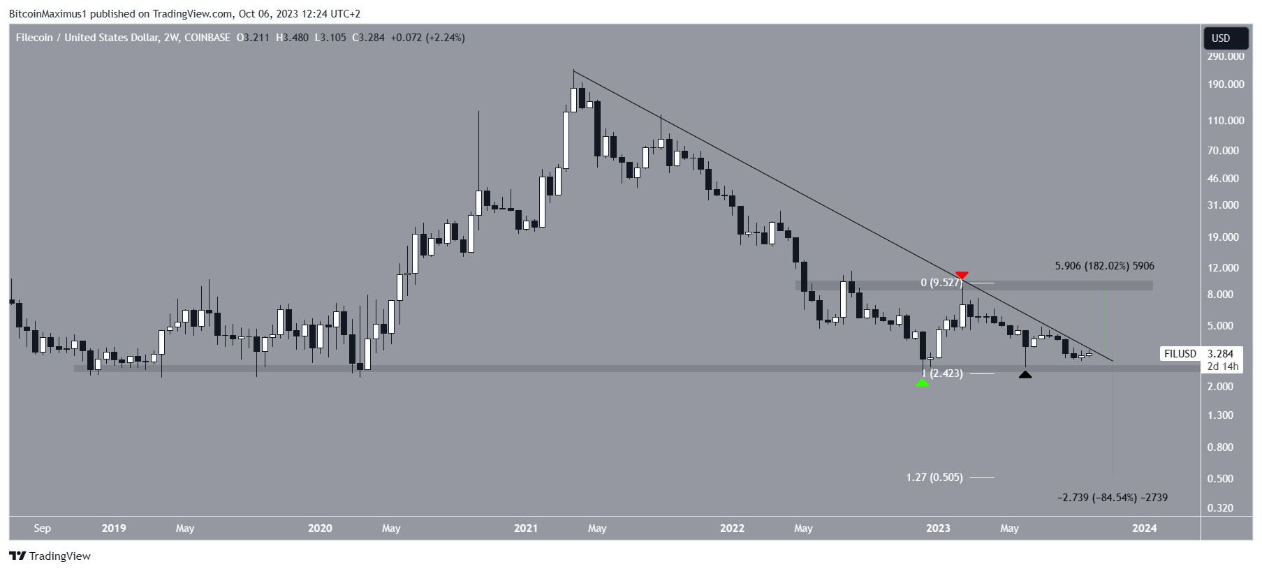 Filecoin has nearly reached a long-term descending trendline that has been in place since the all-time high. Whether the price breaks out from the trendline or below the $2.60 area will likely determine the future trend’s direction.