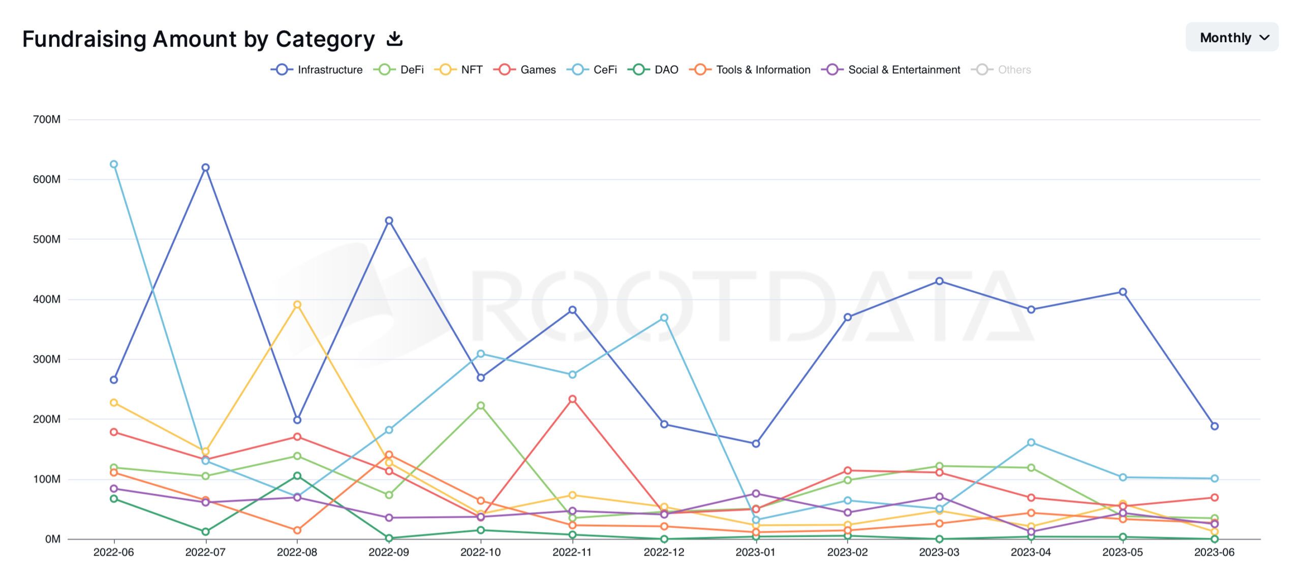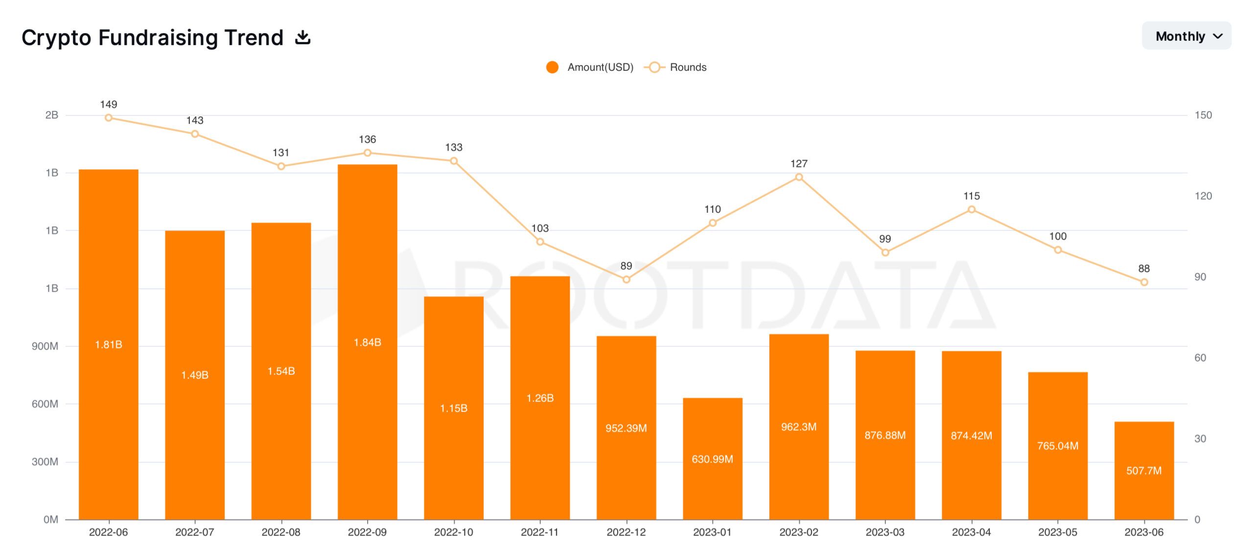 Data from RootData reveals a marked dip in VC funding for crypto startups over the past year. From a high of $12.6 billion in Q1 2022, VC investments dropped to just $2.14 billion by Q2 2023.