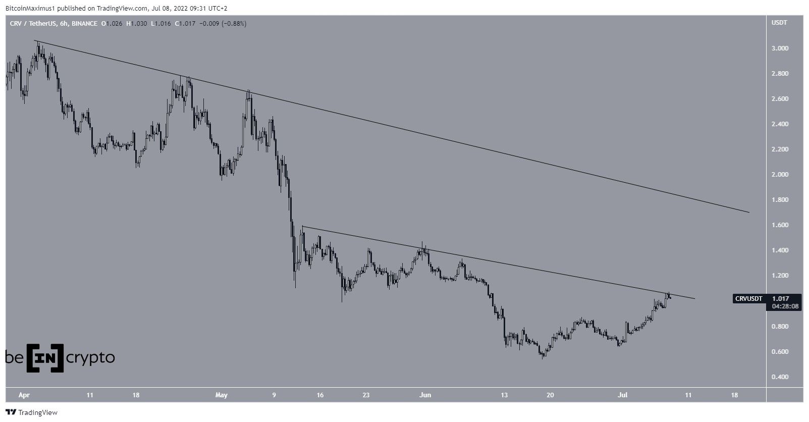 CRV has been moving upwards since reaching a low of $0.535 on June 18. The upward movement has so far led to a high of $1.02. This has taken CRV all the way to a descending resistance line that has been in place since May 11.