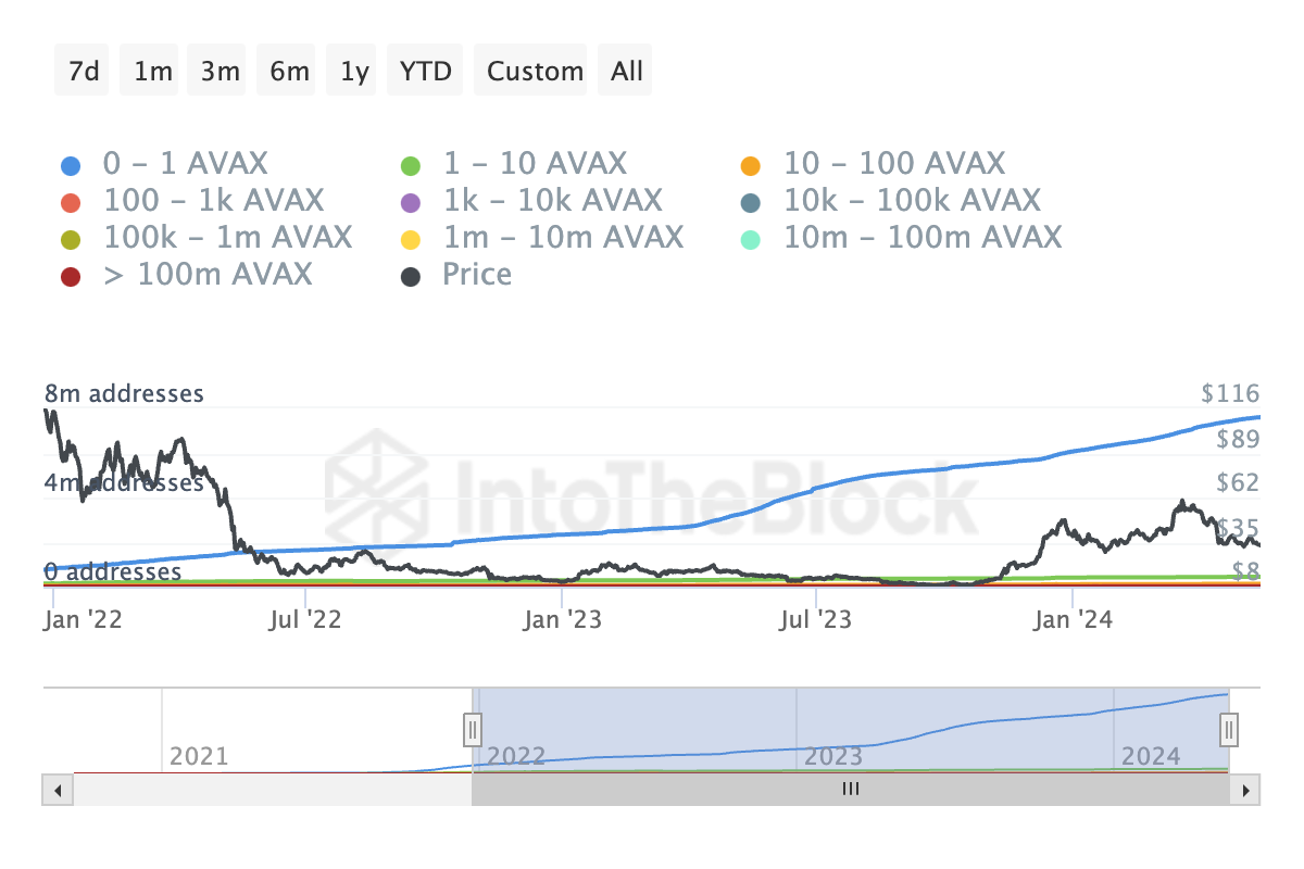 The majority of addresses hold between 0 – 1 AVAX and 1 – 10 AVAX, indicating a large number of small holders. The stability of larger holdings suggests that significant investors are maintaining their positions.