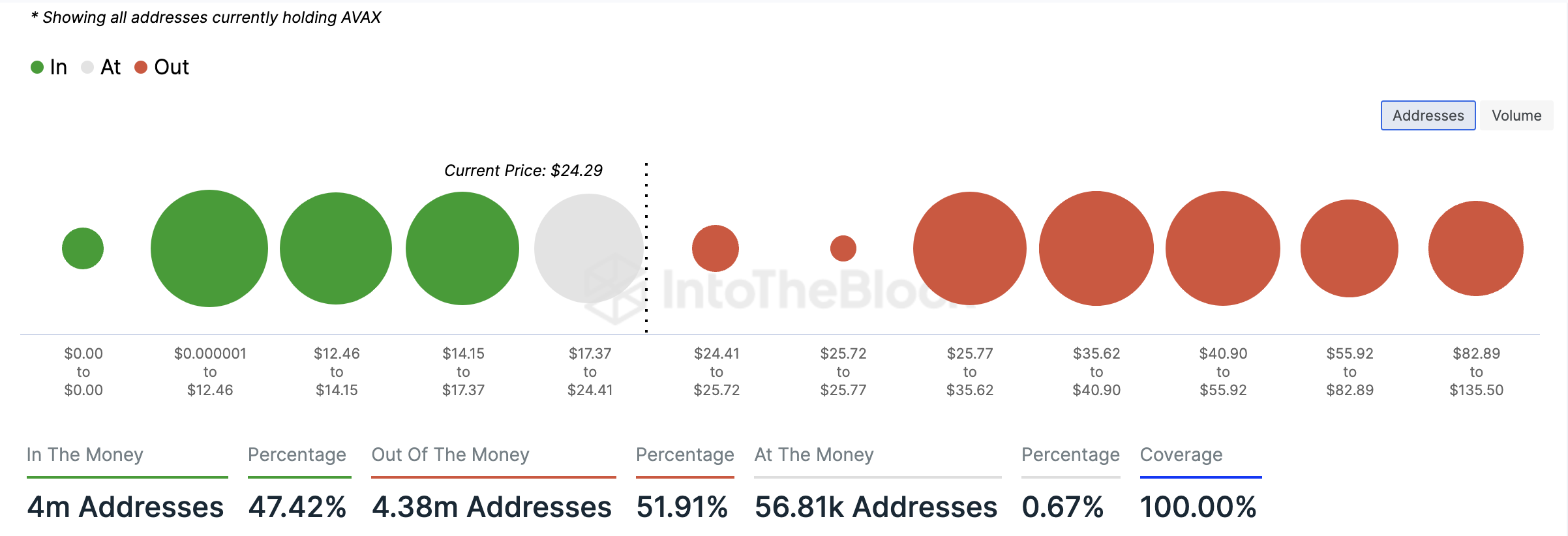 On the other hand, 47.42% of all AVAX’s holders, made up of 4 million addresses, are “in the money.” These are addresses that currently hold the token at a higher price than the average cost at which they purchased their holdings.