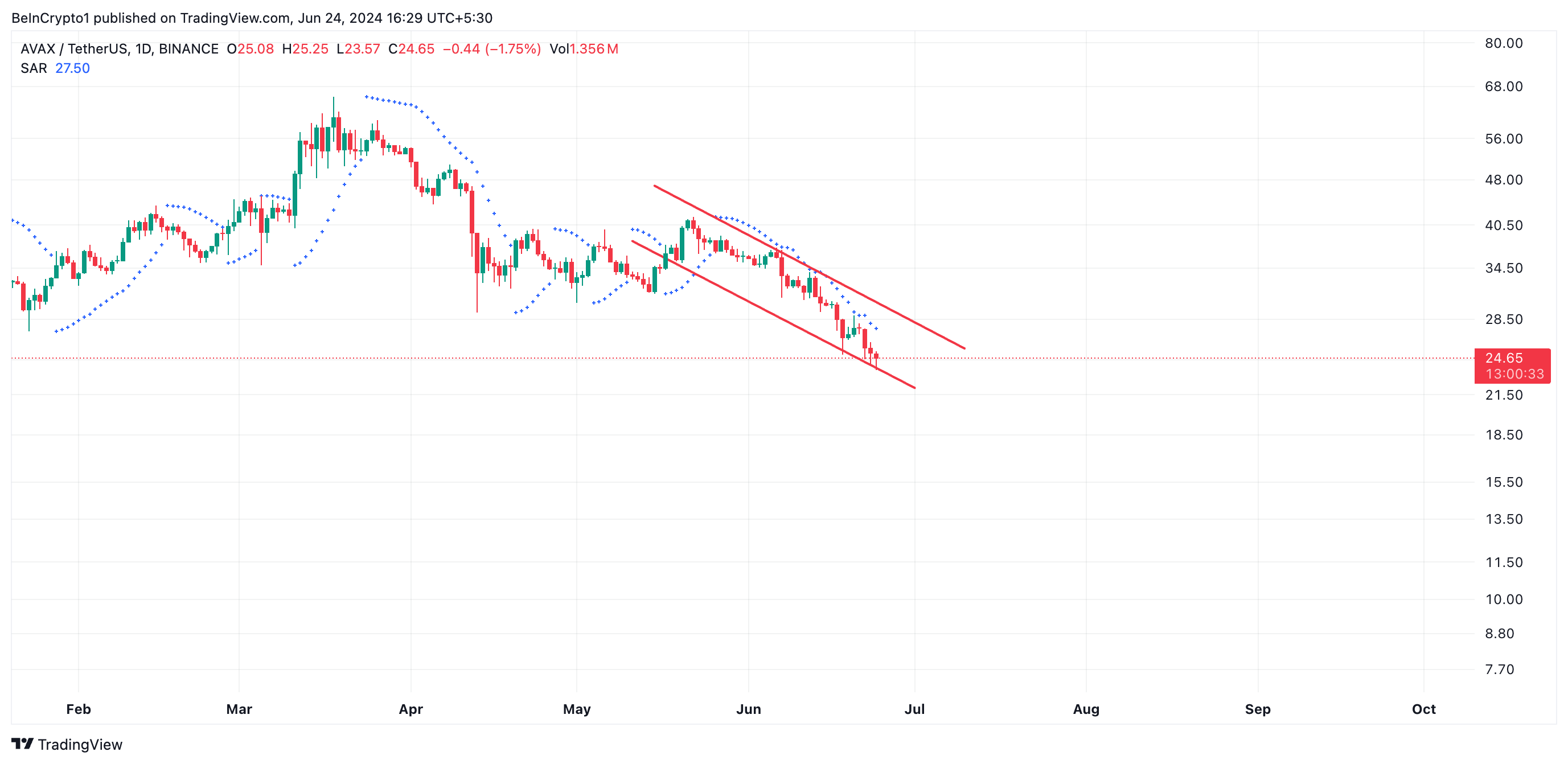 At press time, AVAX is trading at $24.82, close to the support level. If this level is breached, the bearish trend will continue, and the token’s price will fall further.