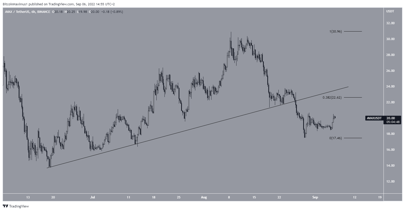 Despite the flurry of positive news, the price has yet to confirm any sort of bullish reversal. To the contrary, AVAX has broken down from an ascending support line that had been in place since the June lows. Such breakdowns usually mean that the preceding upward movement has now come to an end.Â