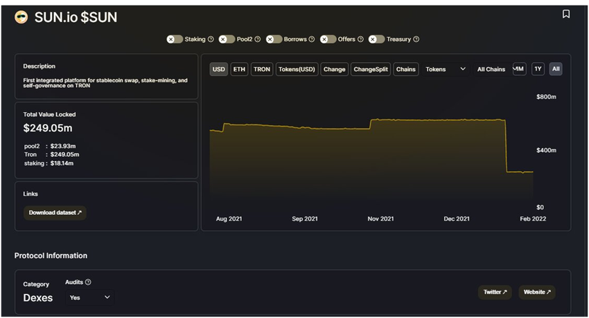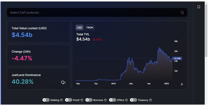 Sponsored SponsoredCurrently, Tron only has a handful of projects. The biggest DAPP, currently, is JustLend (JST) which occupied approximately 43.92% of the TVL on the Tron network. Sun.io (SUN) appears to be a major loser after it lost 62% of its TVL over the past month. SUN opened January 2022 with a $617 million in TVL, but closed the month with a new TVL of $248 million.