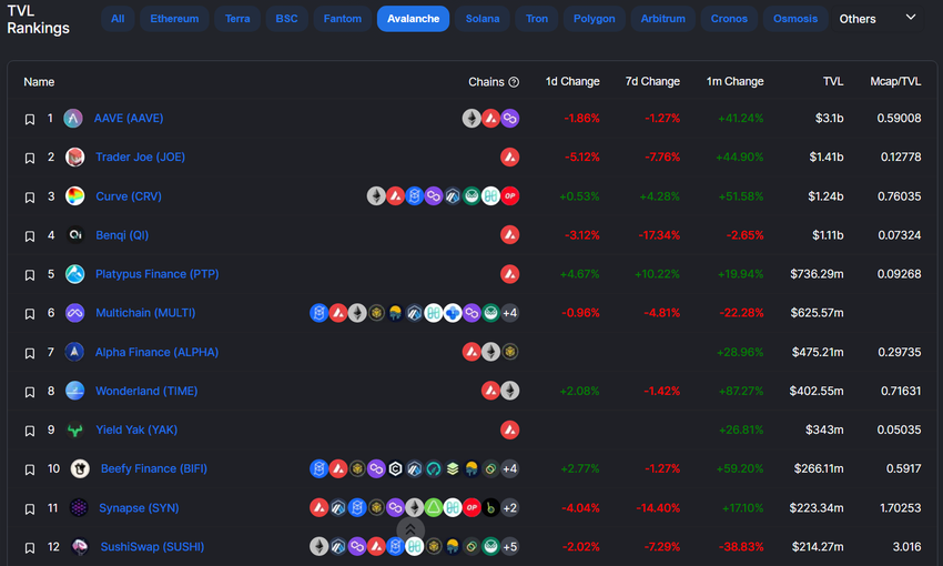 Some of the projects that contributed to the TVL on AVAX include Platypus Finance (PTP), with over $700 million. Wonderland (TIME) with roughly $400 million, and SushiSwap (SUSHI) with $213 million.