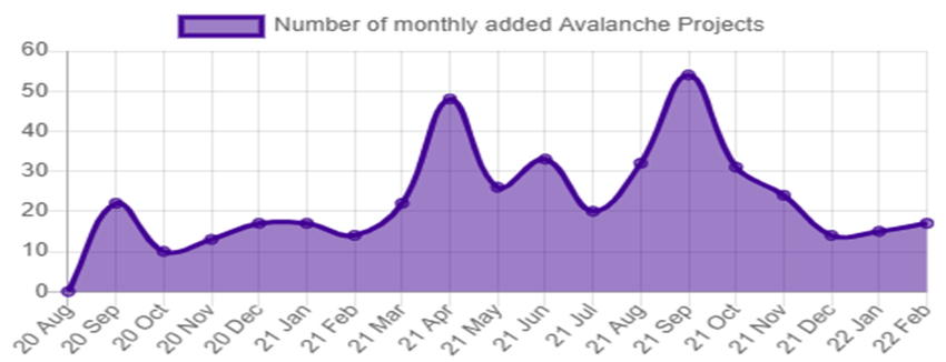 Most of the project’s success stems from a rapidly growing Avalanche ecosystem. AVAX has seen over 428 projects launched from August 2020, until February 2022. 15 of those projects launched in January 2022 alone.