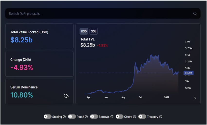 Top ten project, Solana (SOL) might be ranked higher than AVAX in terms of market capitalization. However, its current TVL has slipped behind AVAX in 2022. The end of January 2022 saw Solana’s TVL hit $7.98 billion. Solana’s TVL also saw a decline in January 2022 as the market saw an overall dip in prices. Solana slipped 28% between December 2021 and the end of January 2022.