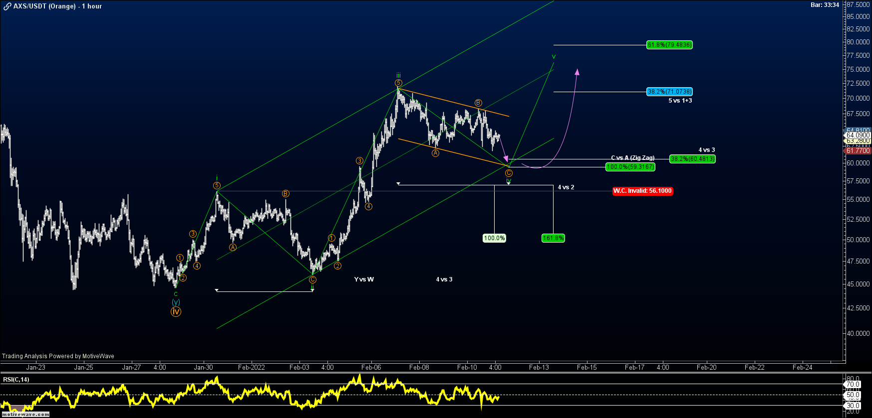 If AXS does not manage to hold on above the current support level, the next main support would be at $59. This is the 0.5 Fib retracement support level and a coincides with the resistance line of a channel connecting the highs of waves one and two (black).