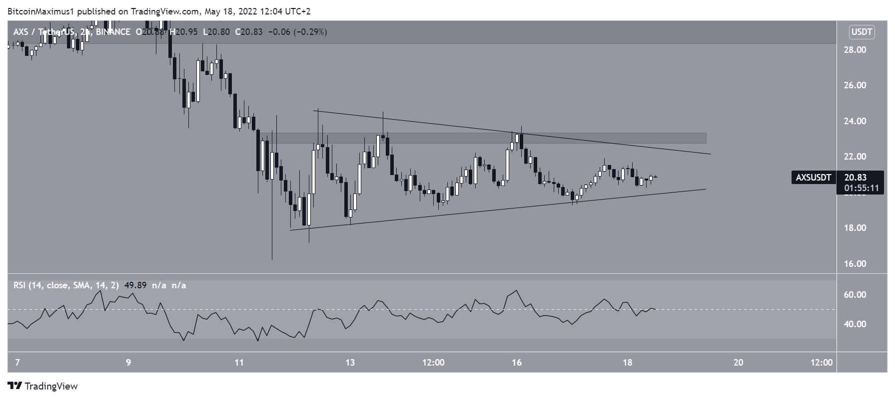 The two-hour chart shows that AXS has been trading inside either a symmetrical or an ascending triangle since May 11. While the former is considered a neutral pattern, the latter is considered a bullish one.
