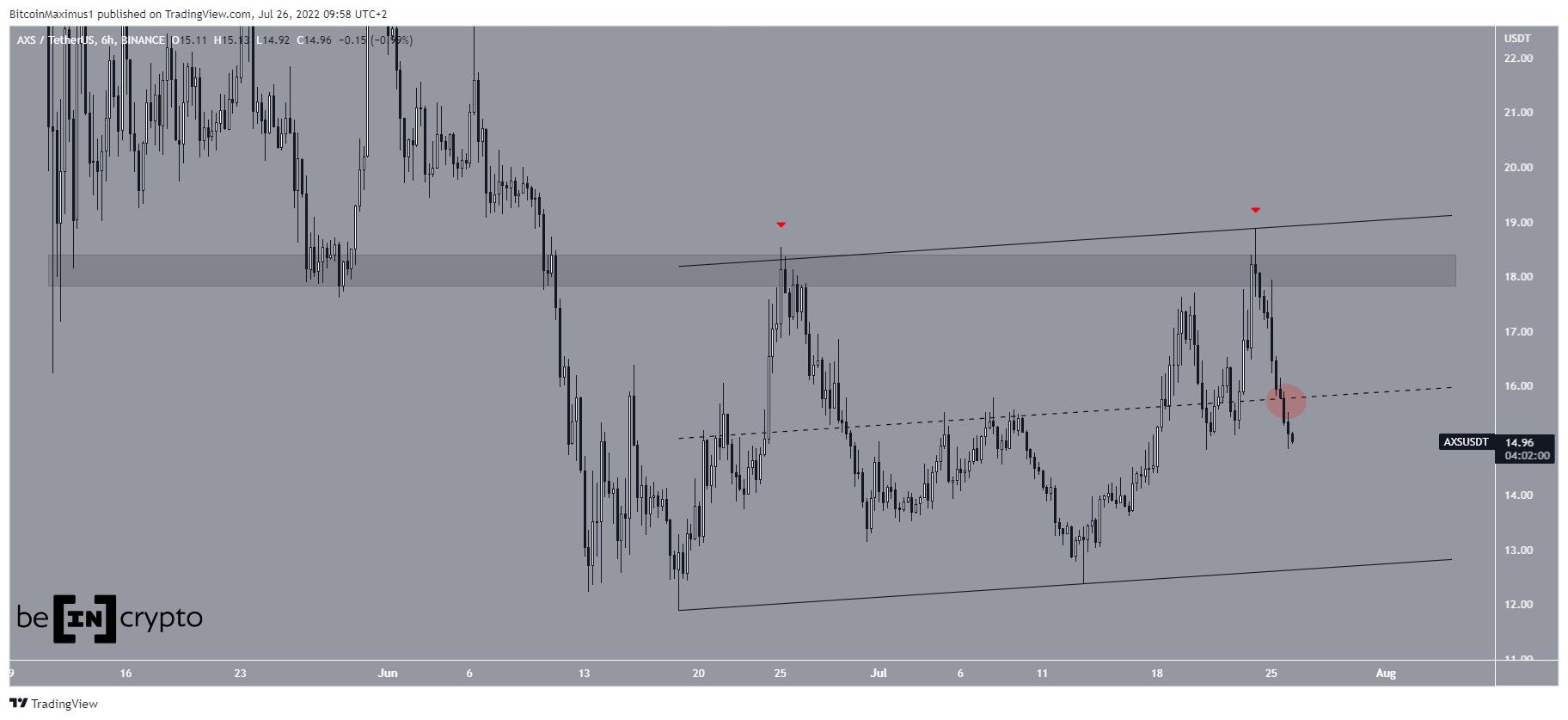 Besides being rejected by the $18 resistance area, AXS has been trading inside an ascending parallel channel since its July lows. Such channels usually contain corrective movements, meaning that a breakdown from it would be likely.Â