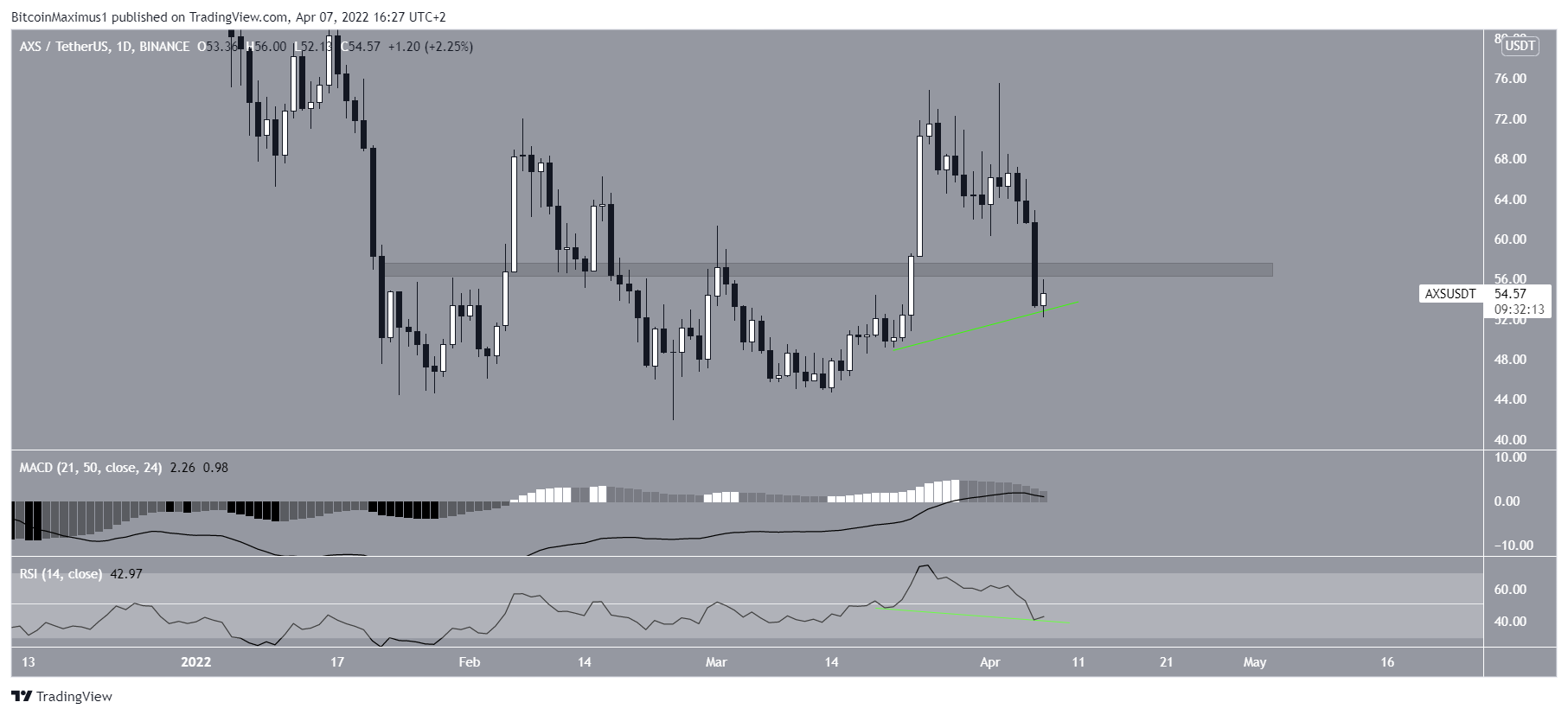 However, there is a hidden bullish divergence in the RSI and the MACD is still positive. Nevertheless, these signs are not sufficient in order to predict a potential bullish trend continuation, especially since AXS failed to hold on above the $55 area.