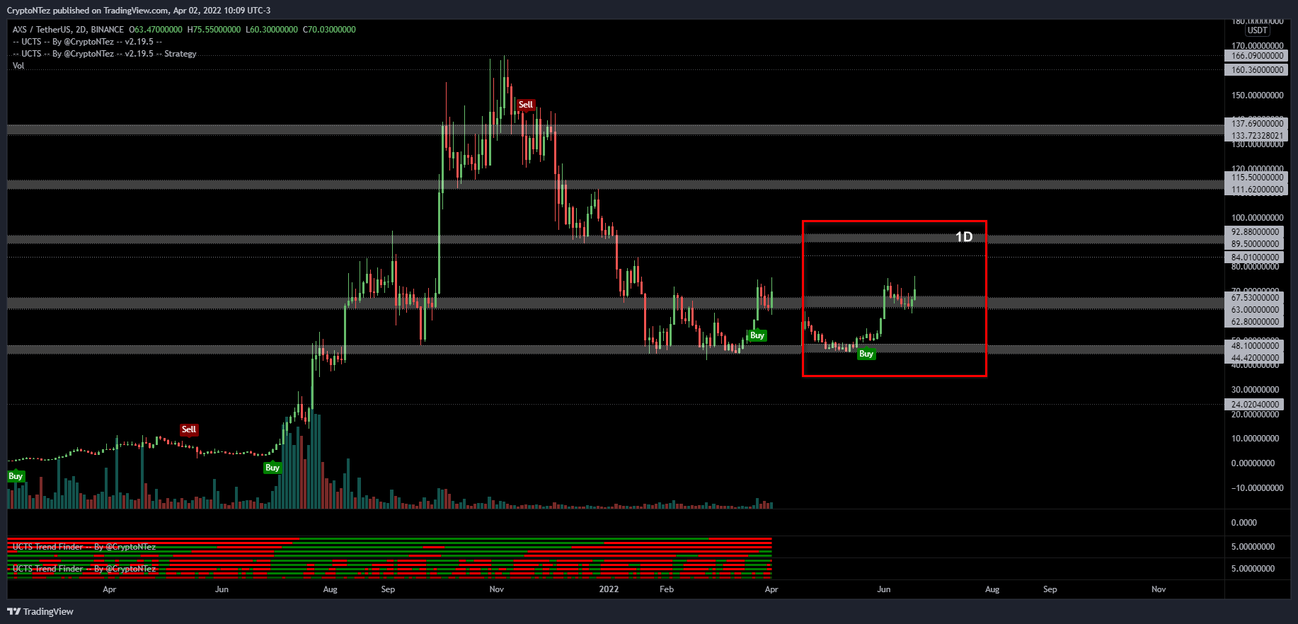 Cryptocurrency trader @CryptoNTez tweeted a chart of AXS, stating that the coin is currently accumulating and trying to flip the $65 area as support.