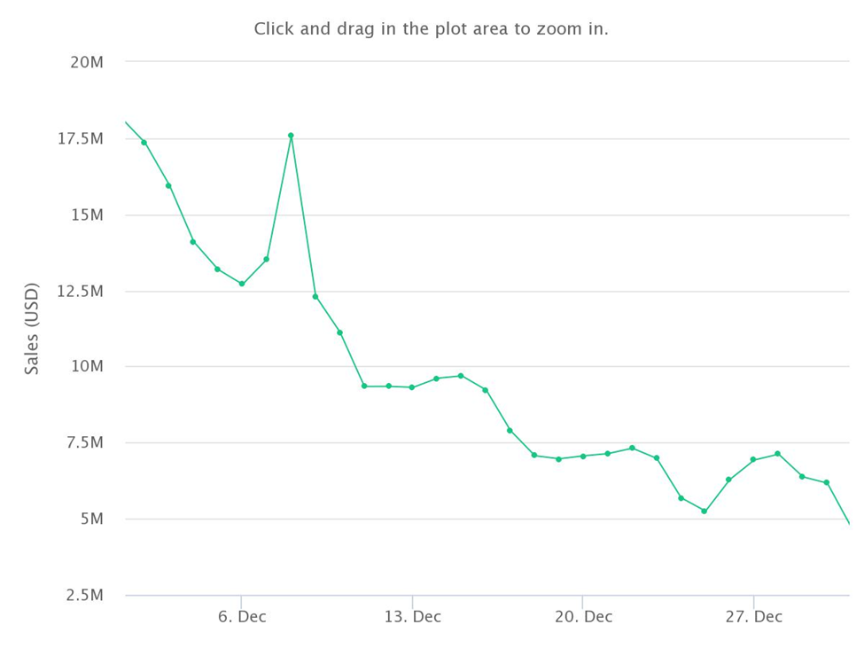 Axie Infinity shed 60% of November’s new high in December 2021 after the market flipped bearish and sales volume dipped to $301 million.