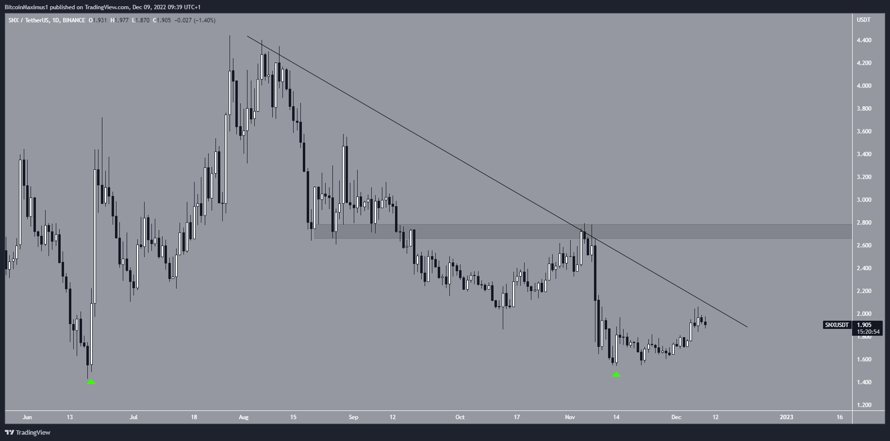 The SNX price has fallen below a descending resistance line since Aug. 13. The line caused a rejection on Nov. 5 and led to a low of $1.54 10 days later. This was slightly above the yearly low of $1.42. In turn, it created a double bottom pattern (green icons). The SNX price has increased since.