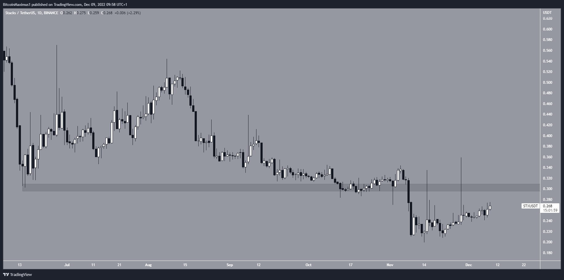 The STX price has increased since Nov. 14, when it fell to a new yearly low of $0.20. Despite the upward movement, the price is trading well below the $0.30 resistance area. This is a crucial level since it has previously acted as support since June 13.