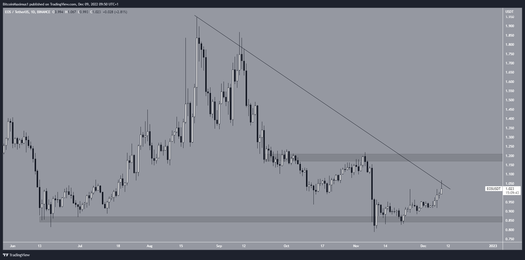 Currently, EOS is in the process of attempting to break out from a descending resistance line that has been in place since Aug. 19. If successful, this could lead to a price target of $1.15