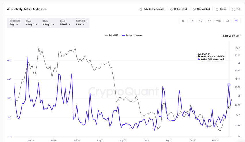 As AXS price sank toward $4 on October 19, the Axie Infinity network witnessed a significant increase in user activity, according to data from CryptoQuant.