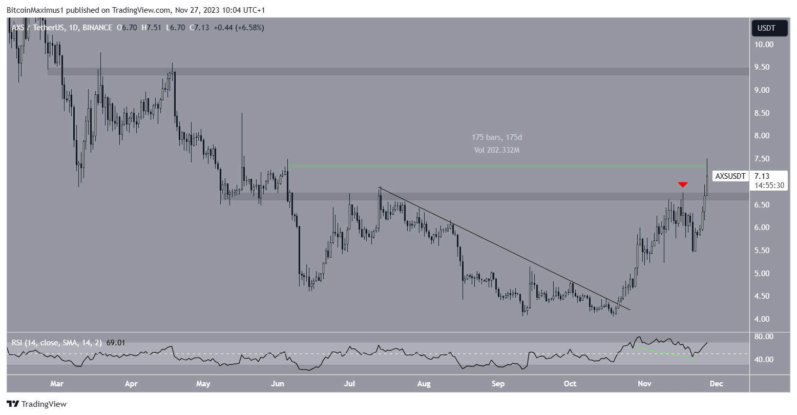 Initially, the price was rejected by a pivotal horizontal resistance area that has stood since June (red icon). However, the AXS price regained its footing shortly afterward and broke out today. The price reached a high of $7.51 before a small drop.