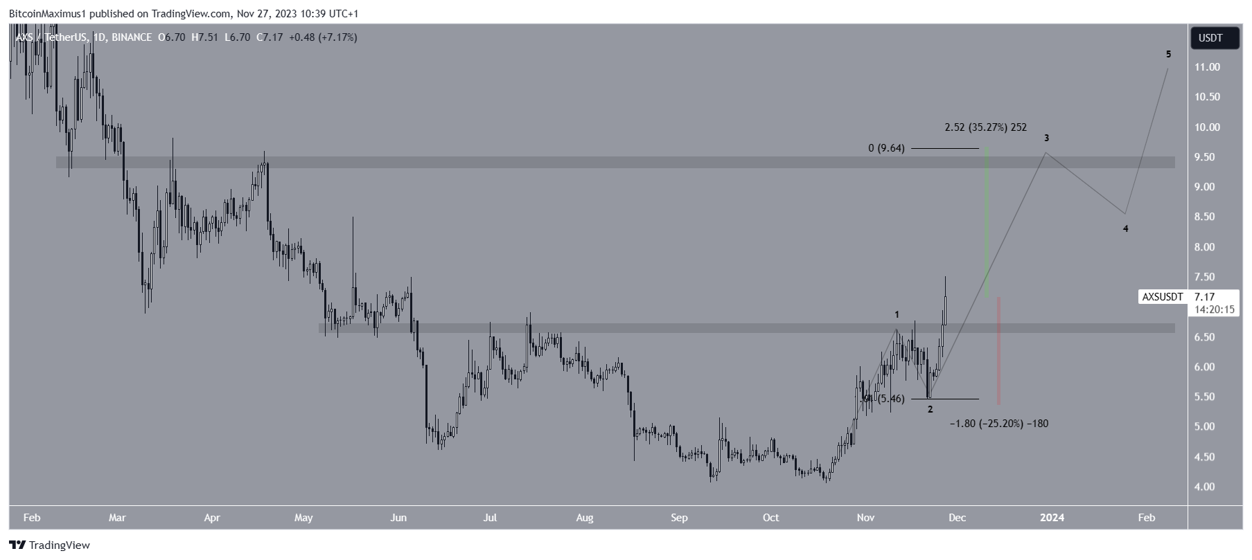 If wave five extends to 1.61 times the length of wave one, the AXS price will reach a high of $9.60 before correcting. This will align with the $9.50 horizontal resistance area and is an increase of 35% from the current price.