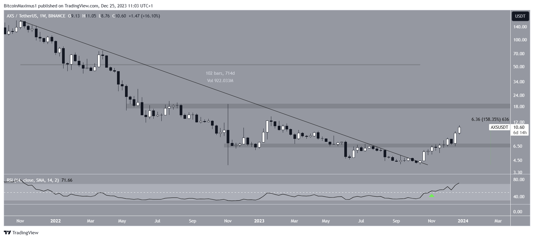 The AXS price has increased since October, when it broke out from a long-term descending resistance trend line. Before the breakout, the trend line had been in place for more than 700 days, specifically since the all-time high of November 2021.