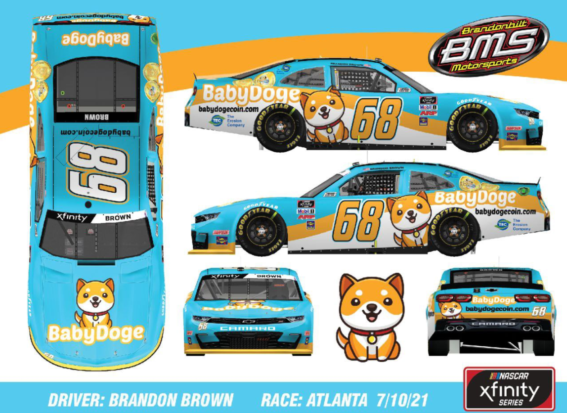 The cryptocurrency craze in NASCAR continues in Atlanta this week with Brandon Brown’s No. 68 Camaro being sponsored by Baby Doge. The coin, an offshoot of the meme coin Dogecoin (DOGE), has been labeled as the world’s first cryptocurrency that is dog-charity-based.