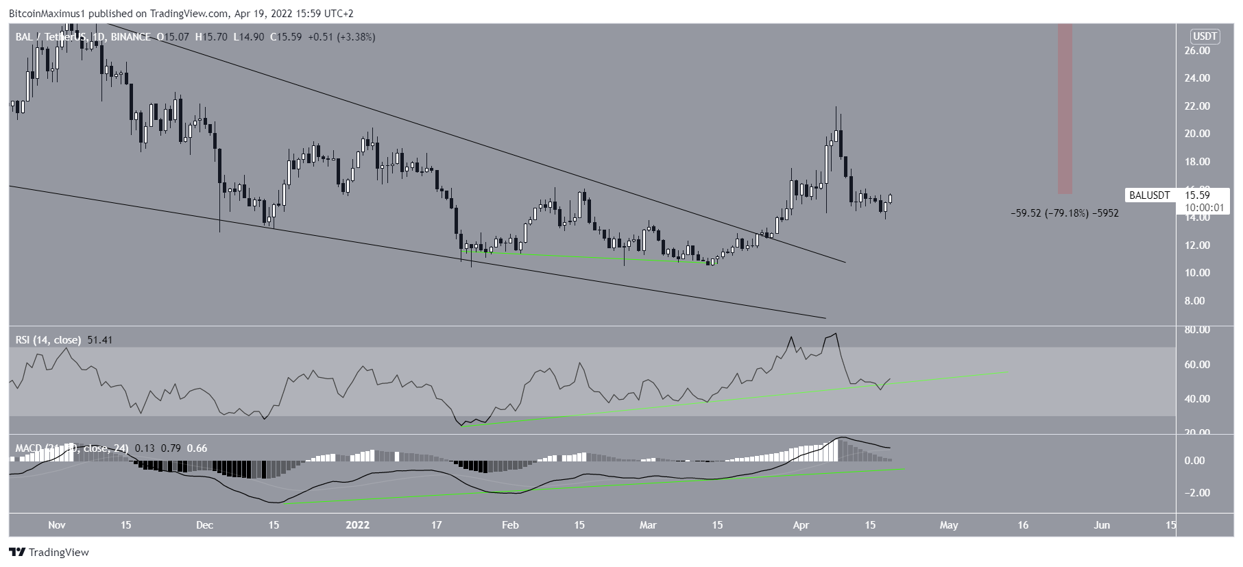 A closer look at the daily time frame shows that the ongoing breakout was preceded by bullish divergence in both the RSI and MACD (green lines). Such divergences usually precede bullish trend reversals, as was the case with BAL.Â