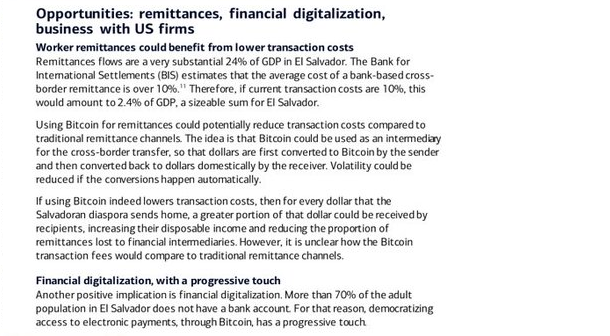 SponsoredThe report, released on July 26, talks about the overall economic viewpoint of El Salvador, and the section in question talks extensively about the opportunities in remittances, digitization, and business operations. The author believes that bitcoin’s adoption can help with all of these aspects of the economy.