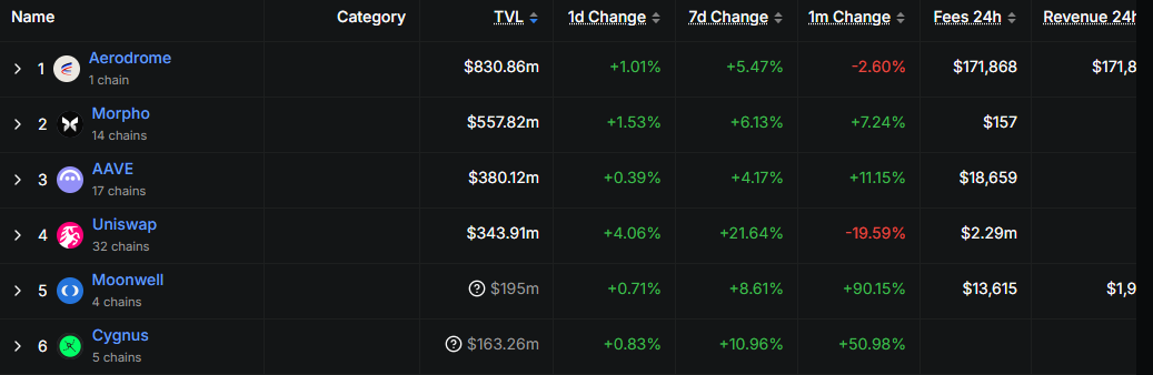 SponsoredAerodrome remains the leading protocol on Base L2. It boasts up to $830 million in TVL, up 5% in the last week. Other leading protocols on Base include Morpho, Aave, and Uniswap.