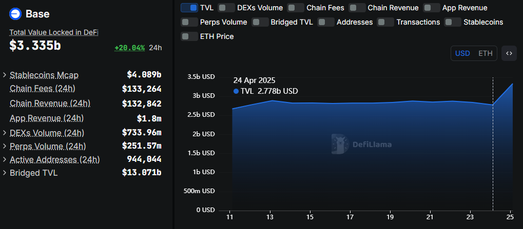 According to data on DefiLlama, Base TVL is up by $557 million. It moved from $2.778 billion on Thursday to $3.335 billion as of this writing, a 20% surge in the last 24 hours.