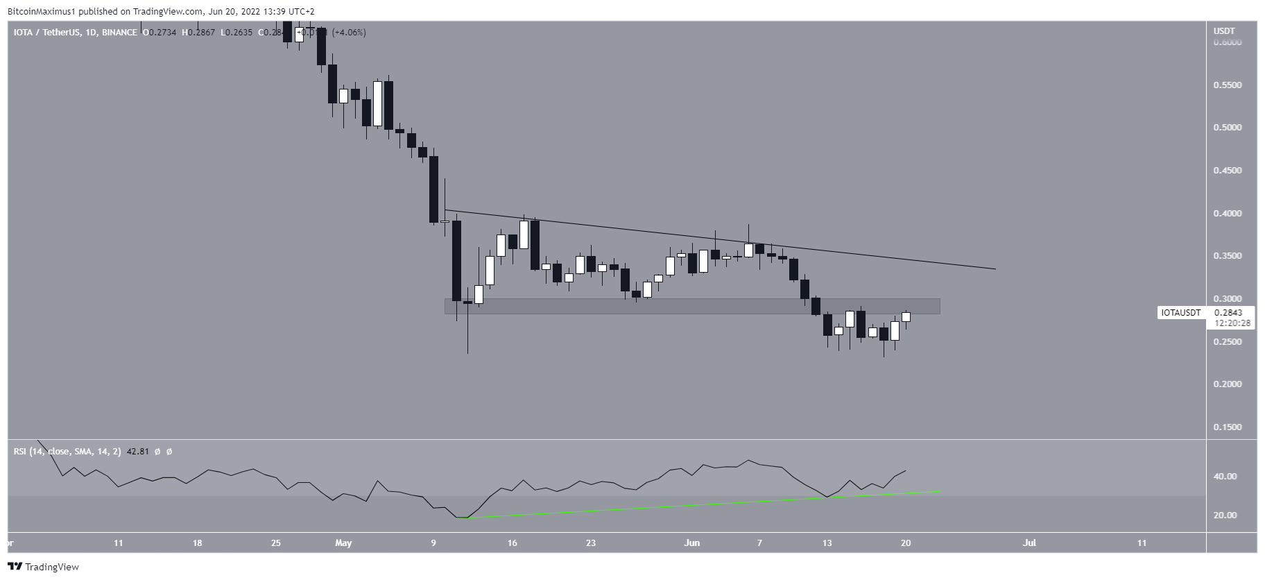 IOTA (IOTA) has been decreasing underneath a descending resistance line since May 13. This led to a low of $0.23 on June 18.Â