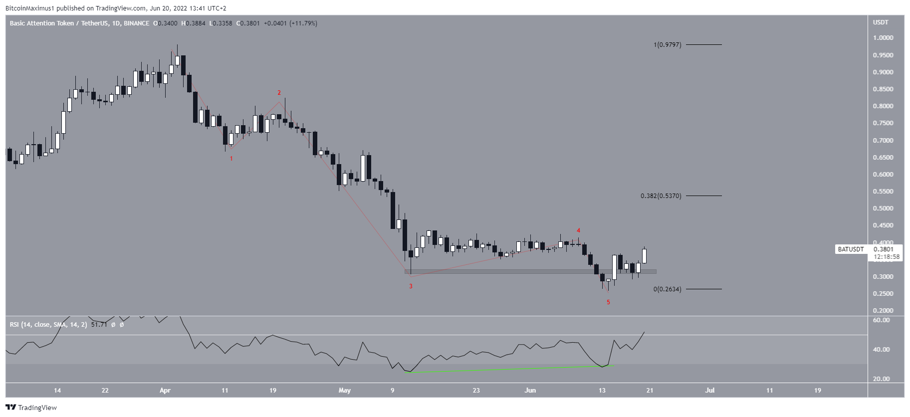 Basic Attention Token (BAT) had been decreasing in what looks like a five-wave downward movement (red) since the beginning of April, leading to a low of $0.258 on June 14. The price bounced afterwards, reclaiming the $0.315 area in the process.Â