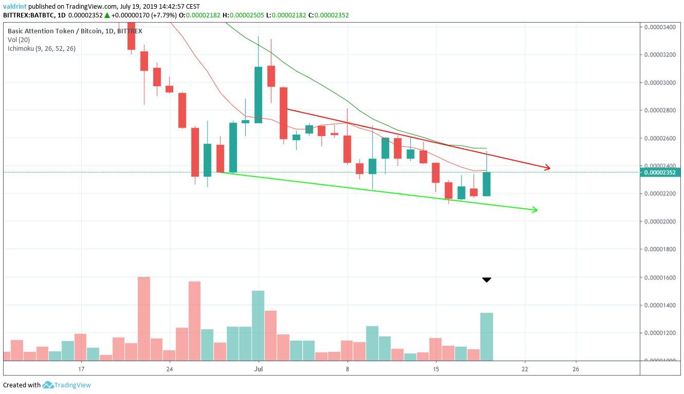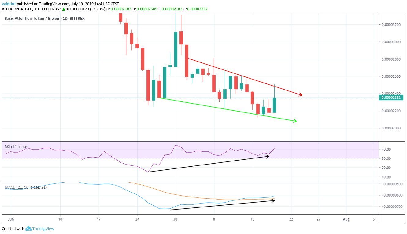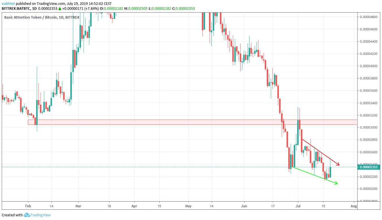 A look at the six-hour time-frame shows that BAT has been trading inside a descending wedge since reaching the aforementioned low on June 28.