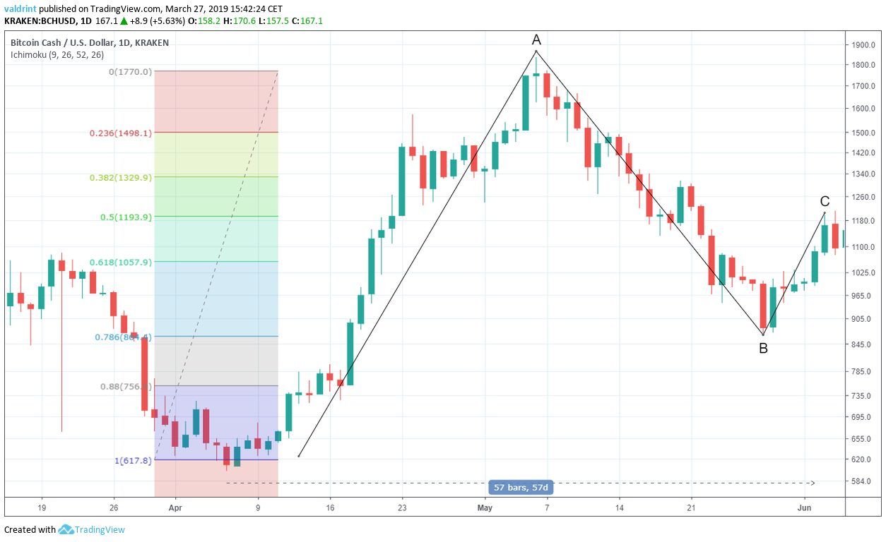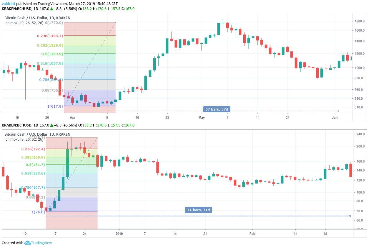 A gradual decrease ensued. BCH made a low of $104.60 on Jan 28, 2019. Measuring from bottom to top, this amounts to a retrace of 78.6%.