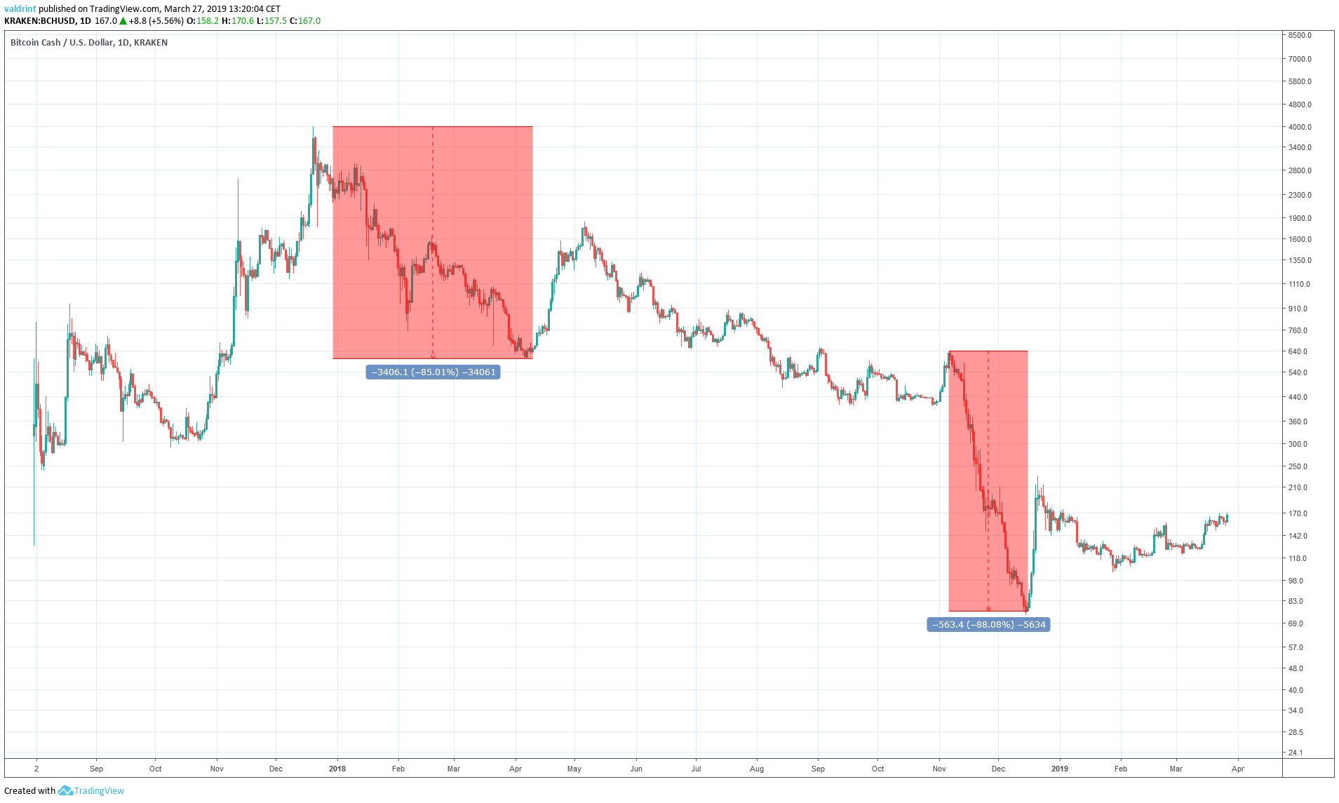 On Dec 20, 2017 the price made a high of $4000.10. Gradual and rapid drops brought Bitcoin Cash to a bottom of $599.60 on Apr 6, 2018. Measuring from top to bottom, the rate of decrease is 85%.