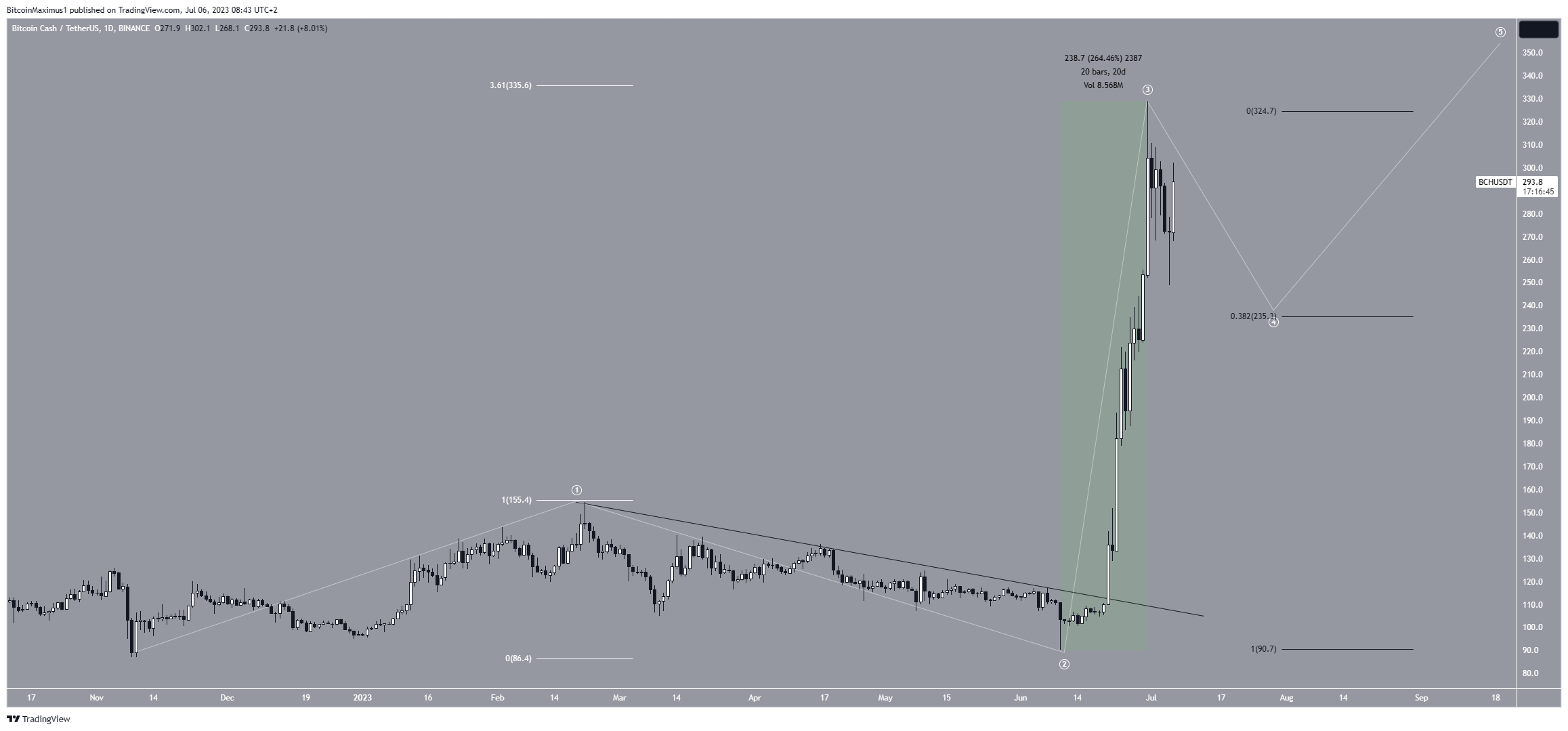 However, the increase since the breakout has been nothing short of unprecedented for BCH. The price increased by 260% without experiencing any retracement, leading to a new yearly high of $320 on June 30. This is the highest price since April 2022.