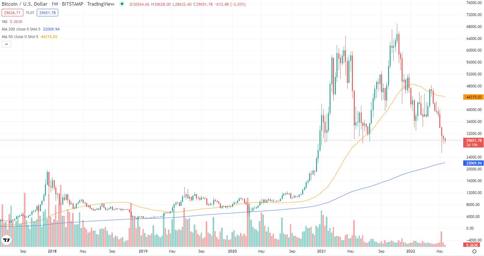 One major level of support, which has been held during previous bear cycles, is the 200-week moving average. This is currently at the $22K price level according to Tradingview so that could be where things are heading in the next couple of months. However, a fall to this technical indicator would be a correction of 68%.