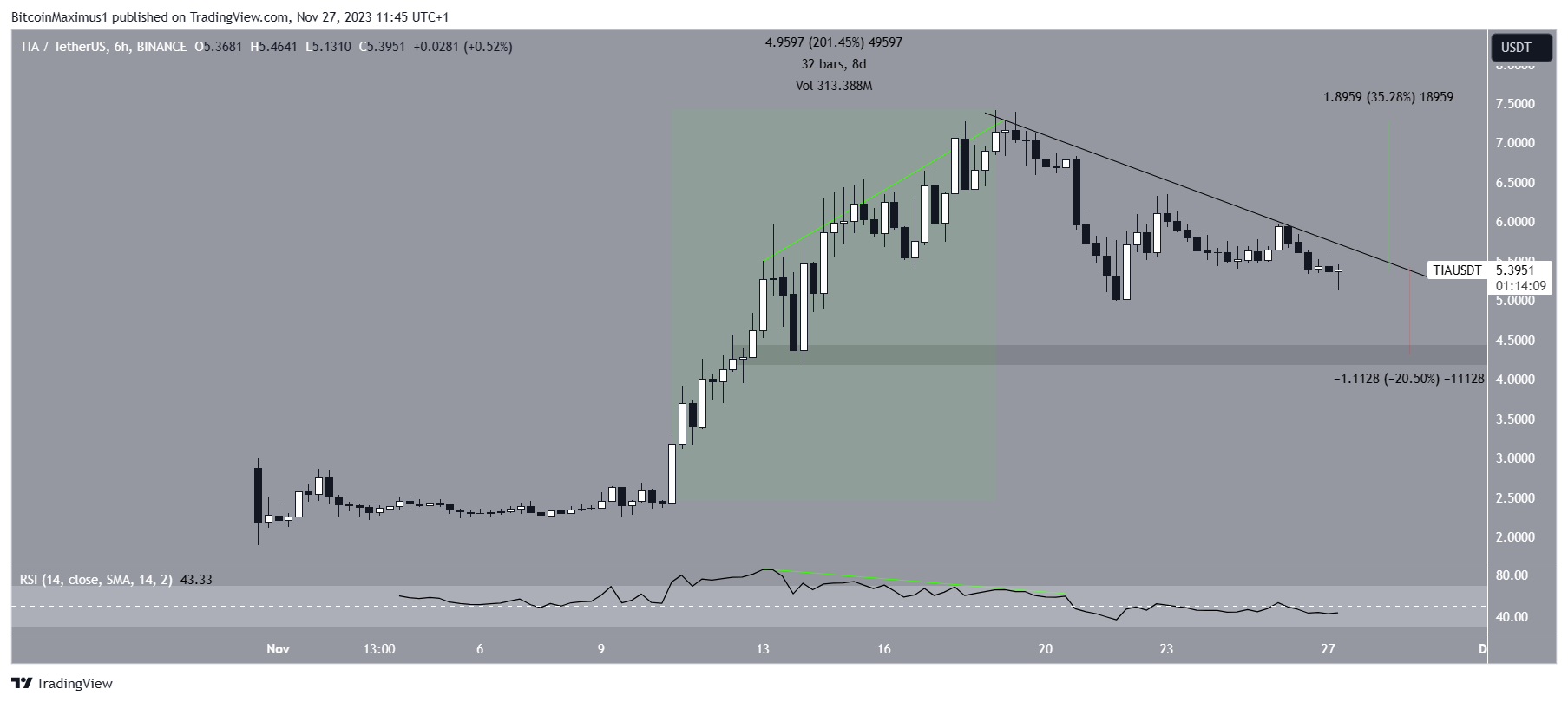 The TIA price began a massive upward movement on November 10, increasing by 200% in the next eight days. The upward movement culminated with a new all-time high price of $7.42 on November 18. However, the altcoin has fallen since.