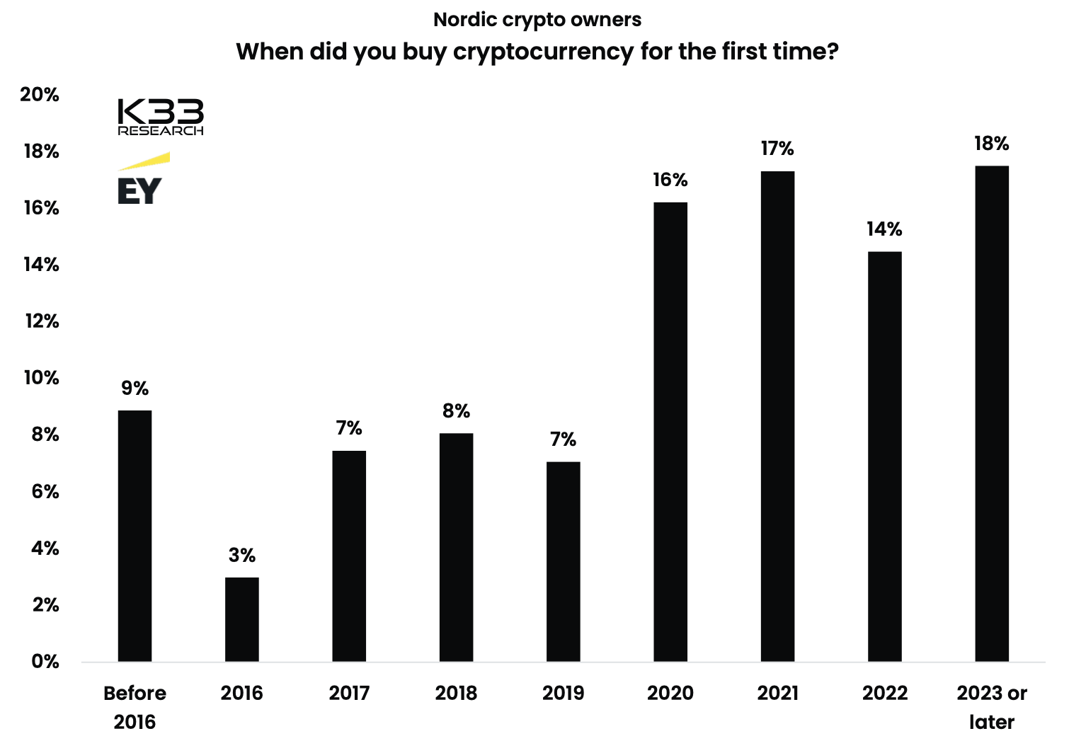 “The largest gains have been made by the people who entered early. Interestingly, we see that 9% bought crypto prior to 2016. In numbers, this means that 140,000 people in the Nordics bought crypto in 2015 or earlier,” researchers at K33 Research and EY wrote.