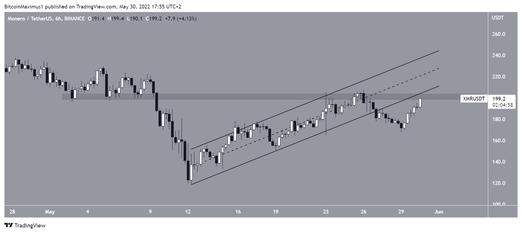 XMR had been increasing inside an ascending parallel channel since May 12 but broke down from the channel on May 27. Despite the breakdown, it has regained its footing and is currently attempting to reclaim the support line of the channel.