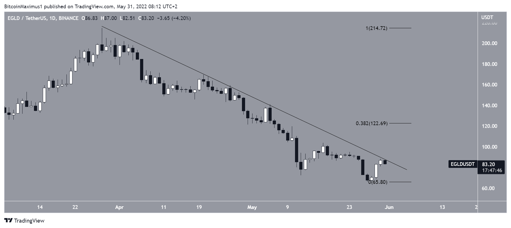 EGLD has been decreasing underneath a descending resistance line since March 28. This downward movement led to a low of $65.68 on May 27.