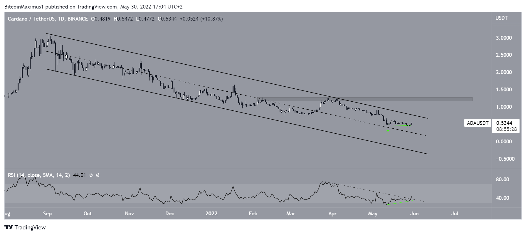 ADA has been decreasing inside a descending parallel channel since reaching an all-time high in September 2021. The downward movement ended on May 12, when ADA bounced at the midline of the channel.