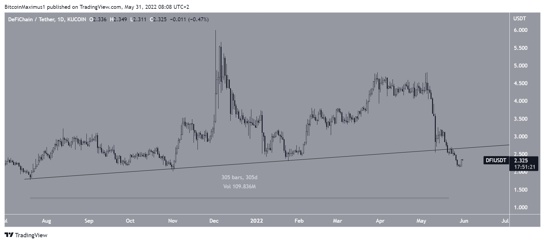 On May 21, DFI broke down from an ascending support line that had previously been in place for 305 days. Until it reclaims this support, the trend cannot be considered bullish.