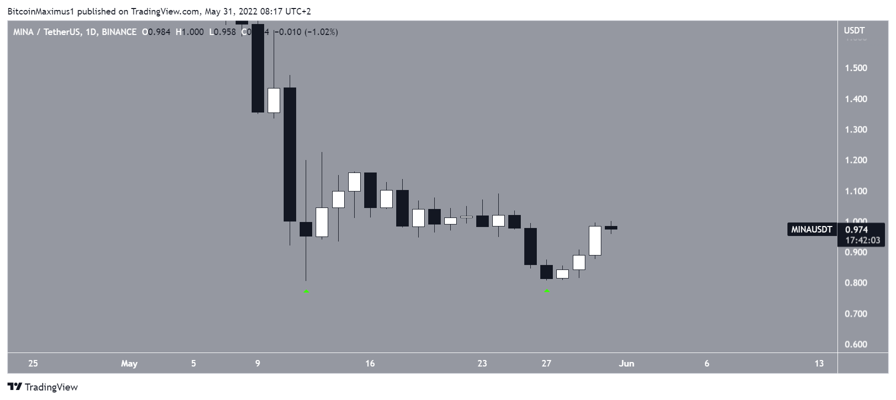 Between May 11 and May 28, MINA created a double bottom pattern close to $0.80 (green icons). While this is considered a bullish pattern, it has yet to result in a sustained upward move.
