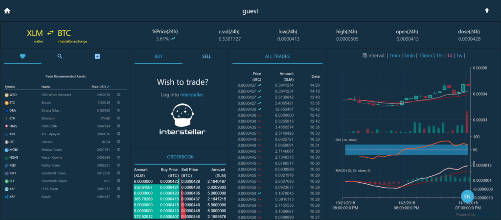 Interstellar is a safe, secure, decentralized XLM wallet that boasts both a ton of features and an exchange — making it one of the best trading clients. It is compatible with Windows, Mac, Linux, and Android, and is a class above when it comes to online wallets.