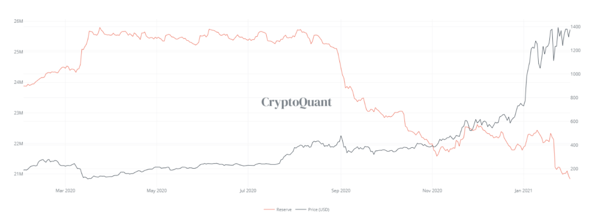 The scarcity narrative is now moving to Ethereum as ETH continues to leave exchanges. A full chart from CryptoQuant shows how exchange reserves have been decreasing considerably since September 2020.