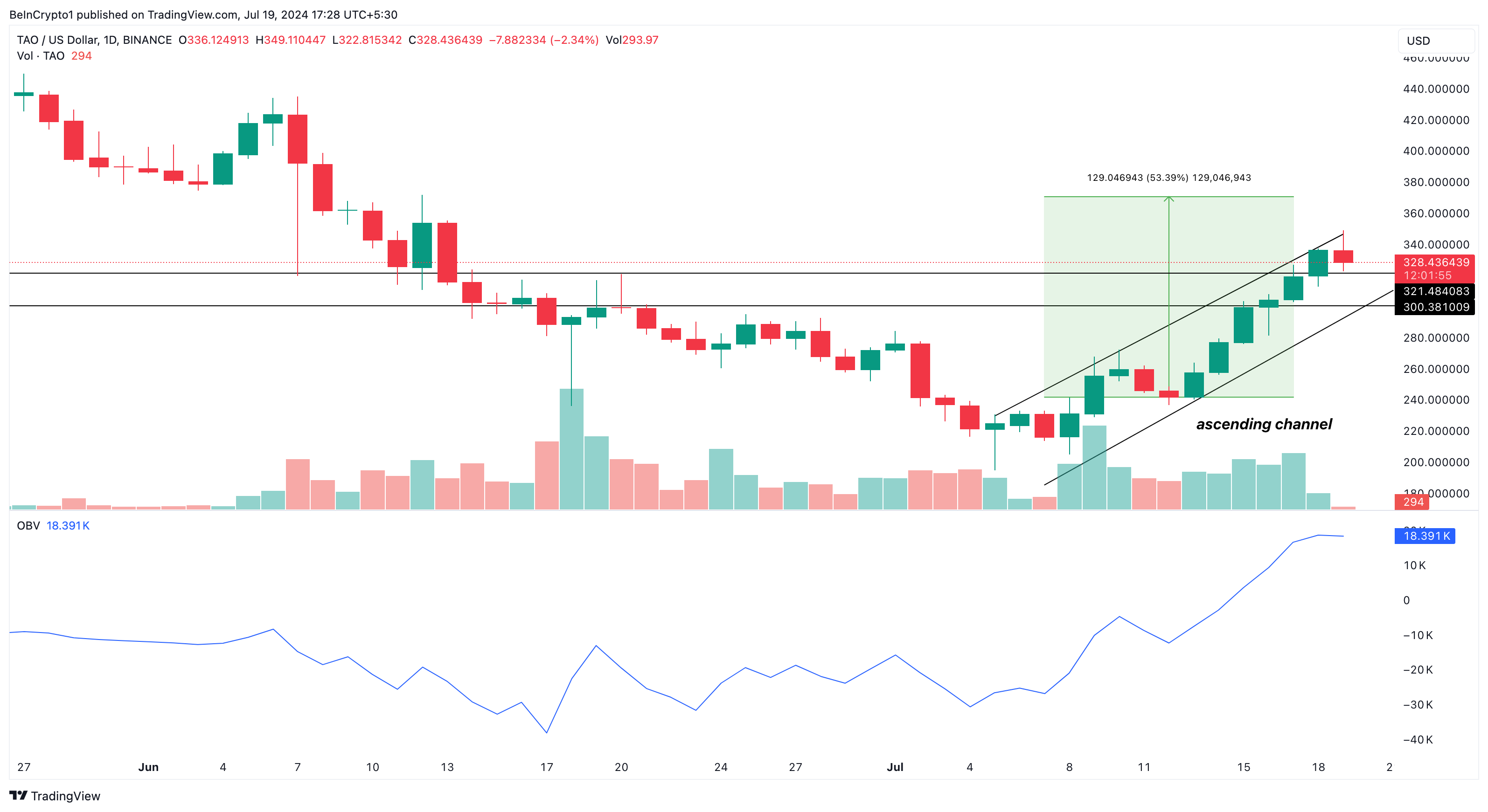 Sponsored SponsoredApart from the pattern, the price growth is connected to the major surge in the price of cryptos with AI fundamentals. As of this writing, TAO’s price is $328.43.