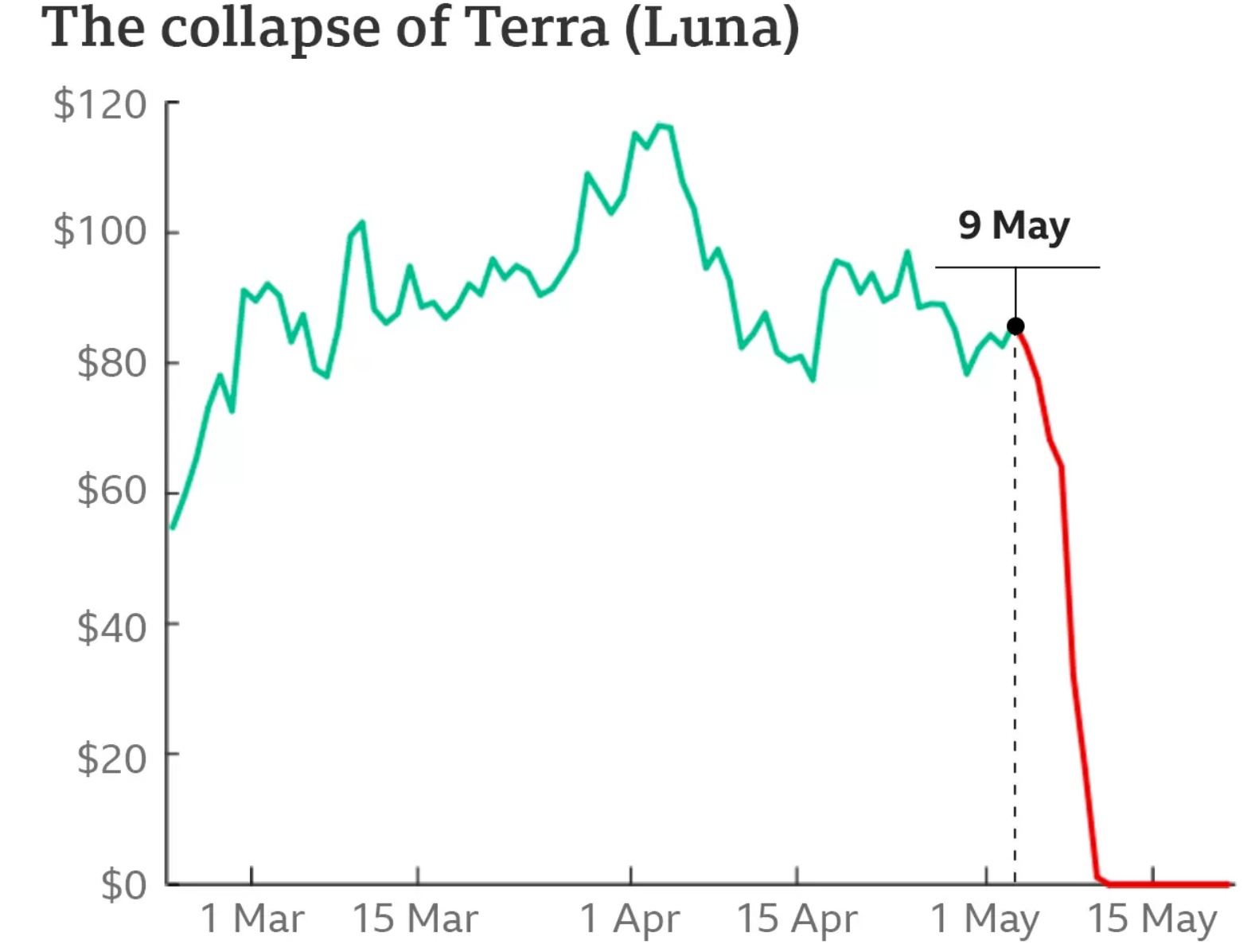 Given that UST was an algorithmic stablecoin that used a series of smart contracts to keep the price at a dollar, it didn’t have billions of dollars of cash or other assets in reserve. Ideally, UST would always be worth one dollar if LUNA has value.