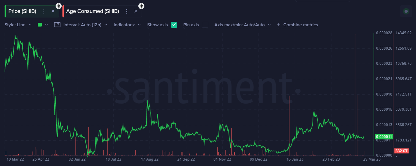 SHIB staged its largest spike of the year on Token Age Consumed on March 20. Spikes on the graph signal a large number of tokens moving after being idle for an extended period.