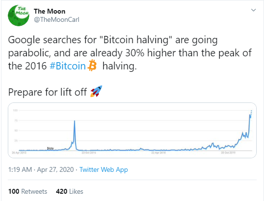 Kraken’s hiring spree is evidence of this trend. There are other anecdotal signs, as well. Twitter account “The Moon” (@TheMoonCarl) observed that the Bitcoin halving event is on the radar of Google searches, tweeting,