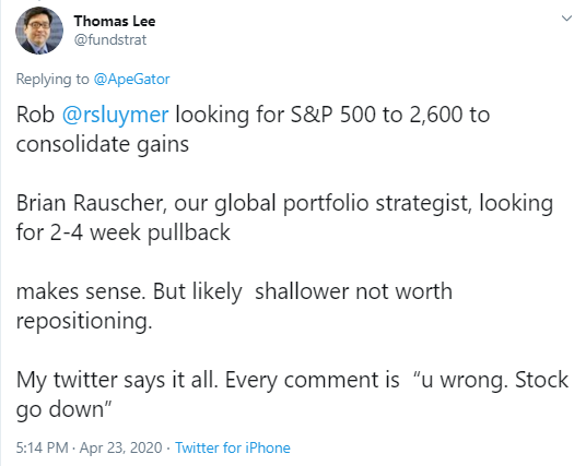 While Gundlach believes that the bottom has yet to fall out in the stock market, Fundstrat Co-Founder Thomas Lee has a more bullish outlook. According to his firm’s research based on prior financial crises, the broader stock market historically finds a bottom before the economy sees the worst of jobless claims. So even though the last wave of jobless claims was abysmal, the S&P 500 index’s reaction suggests there could be a light at the end of the tunnel. In a tweet, he points to the bear markets of 2001-2003 and 2007-2009, stating,